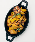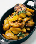 Ingredientes: batata, azeite, óleo, alho, sal, pimenta, tomilho, rosmaninho, sal, pimenta.